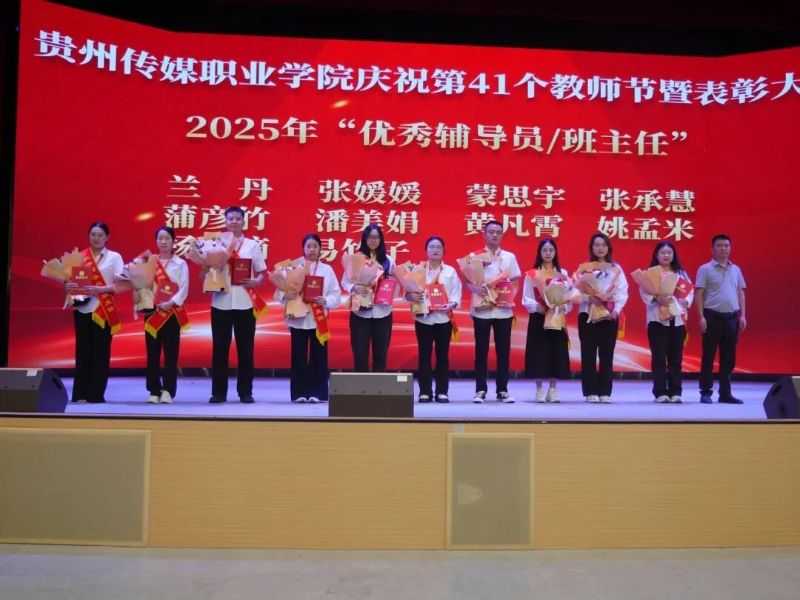 秋韵荡漾,师风化雨。2025年9月11日下午,贵州传媒职业学院在播艺楼小剧场隆重举行庆祝第41个教师节暨表彰大会。大会以“以教育家精神铸魂强师,谱写教育强国建设华章”为主题,全面展现学院教师队伍立德树人、自信自强的精神风貌,弘扬尊师重教文化,凝聚育人合力。贵州省广播电视局党组成员、副局长范华,贵州省广播电视局办公室主任陈高,学院党委书记蒋刘恩、院长李德建、副院长周宏等党政领导班子成员,校企合作企业产业导师代表,全体教职工及学生代表共同参会。