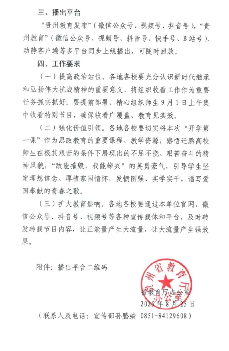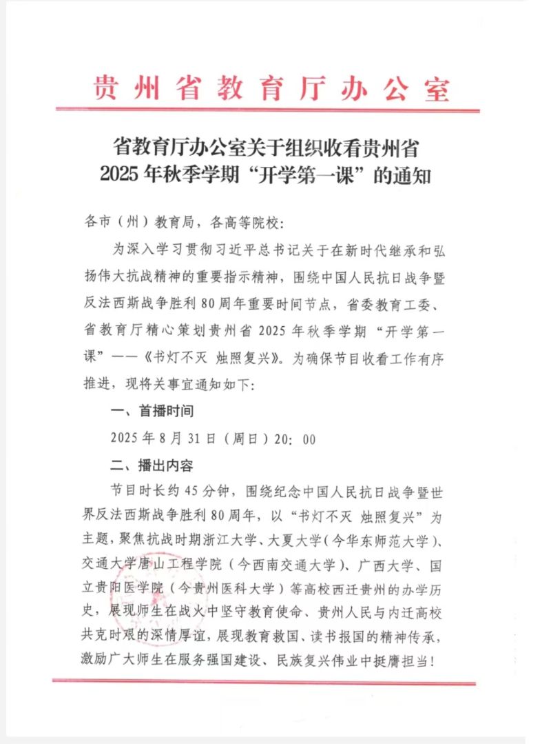 根据省教育厅文件要求,请各系(部)通知本系学生及老师准时观看“开学第一课”,现将相关事宜通知如下: