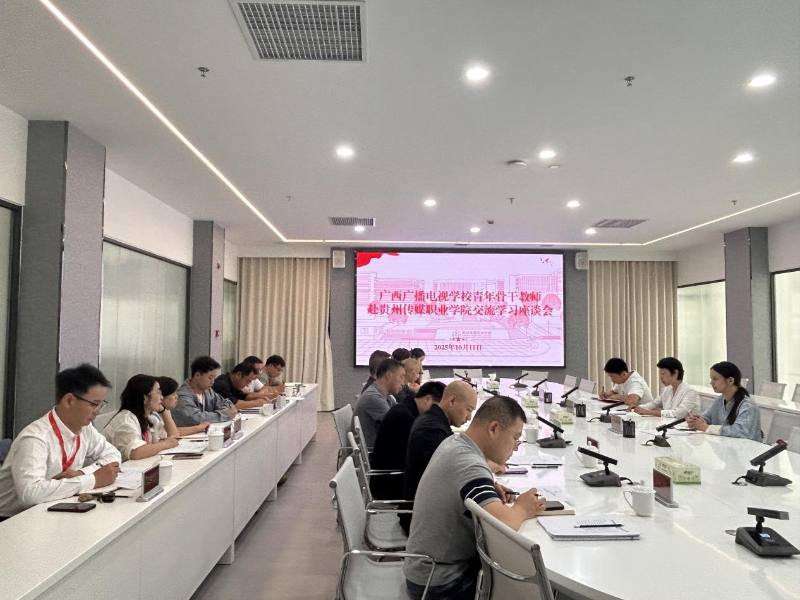 2025年10月11日,广西广播电视学校三位青年骨干教师赴贵州传媒职业学院交流学习的座谈会在学院图书馆T225会议室顺利召开。此次座谈会标志着两校为期三个月的广播影视节目制作专业联合培养项目正式启动,双方围绕如何高质量达成培训目标展开了深入务实的交流。