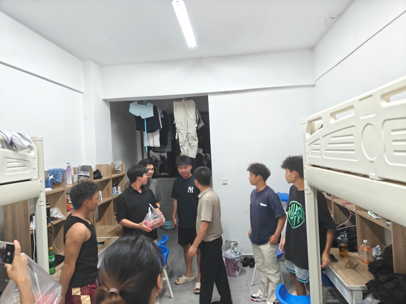 走进新生寝室,陈亮部长一行首先为同学们送上了清甜可口的西瓜,带来一份夏日的清凉与关怀。随后,他仔细查看了学生们的住宿环境,亲切地询问大家:“住宿还习惯吗?”“军训累不累?”“生活上有没有什么困难需要学院协助解决?”看到寝室里被子叠得整整齐齐,物品摆放井然有序,陈部长欣慰地表示,同学们将军训期间的优良作风带到了日常生活中,充分展现了我部学子积极向上的精神风貌和严谨自觉的纪律意识。