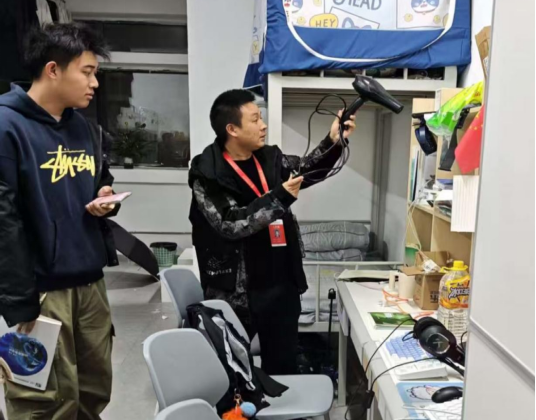 排查小组逐间走访寝室,重点检查插线板违规串联、大功率电器使用、消防通道堵塞等常见隐患,同步督导物品摆放、卫生清洁等情况。排查中,工作人员耐心讲解安全用电、火灾预防常识,对发现的问题当场提出整改意见,明确整改时限并跟踪落实。同学们积极配合自查自纠,主动清理安全隐患,现场形成 “师生联动、共护平安” 的良好氛围。