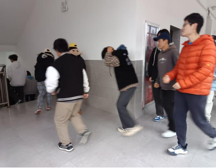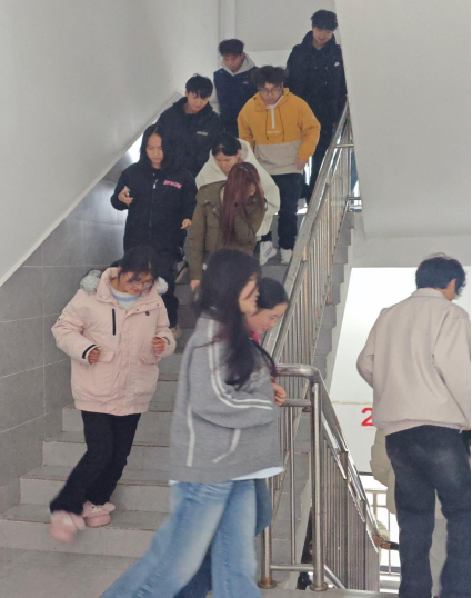 疏散过程中,系部教师和各班级班委在楼梯口、拐角处等关键位置进行指挥和引导。