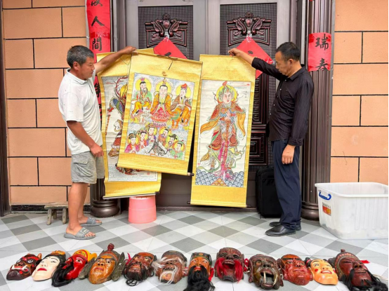 实践队走进始建于清代的陈家祠堂,斑驳的砖瓦诉说着岁月沧桑,祠堂外苍劲的古柏傲然挺立;杨柳溪水库千万片碎金在浪尖跳跃,把云朵的倒影揉成流动的绸缎;起源于唐代的傩戏瑰宝的黎氏阳戏,以九板十三腔唱腔和农耕身段为特色,十四代传承恪守祖训,2021年入选国家级非遗。队员们通过实地调研记录建筑细节,采集口述历史资料。姚孟米老师在实践活动笔记中写道“这些承载的不仅是家族记忆,更是乡村振兴的文化基石。”随后团队登顶天楼山,通过航拍技术记录乡村全景。