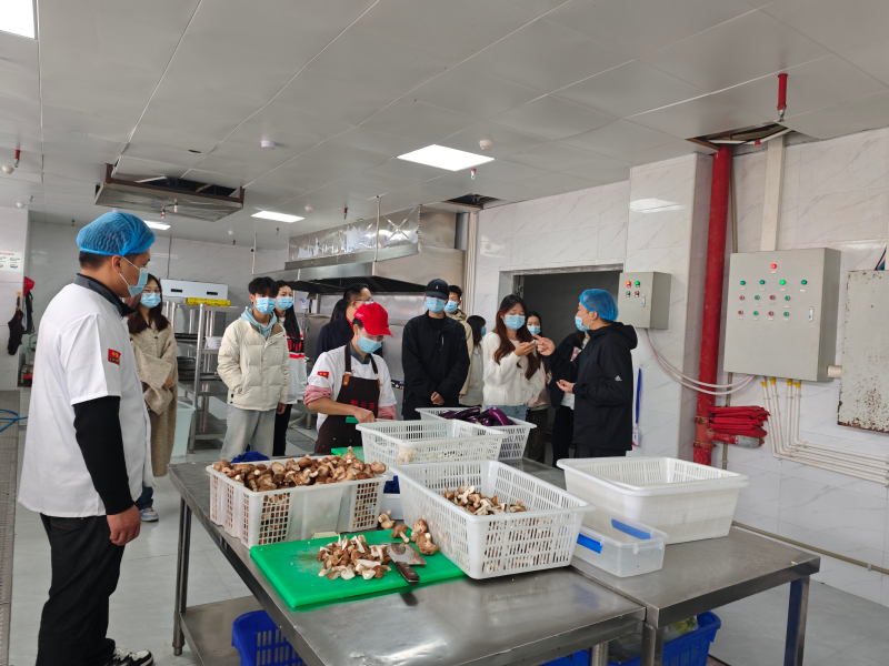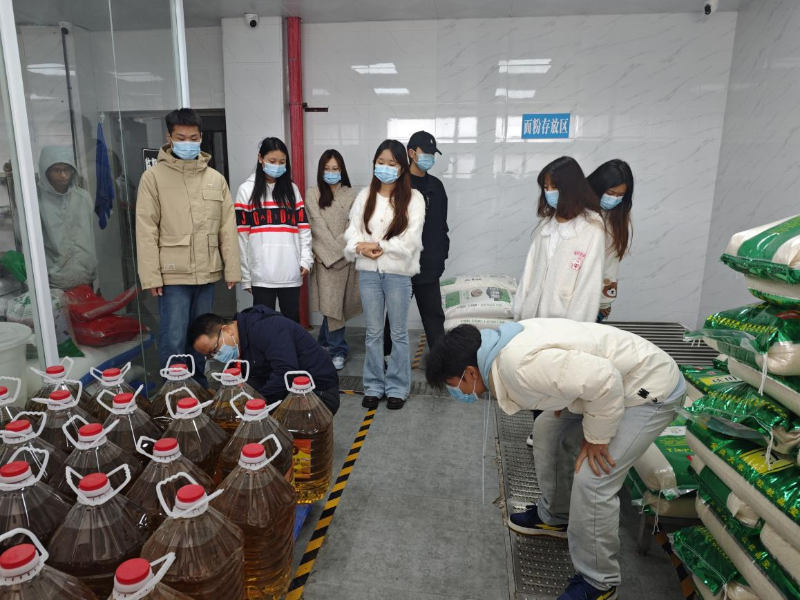 在食材储存间,师生代表认真查看米、面、油等原料的生产日期和储存条件,了解如何辨认变质食材。在加工操作区,地面洁净、厨具整齐摆放、操作规范,食堂承包经营企业管理人员向大家介绍食材从清洗到出餐的全过程。