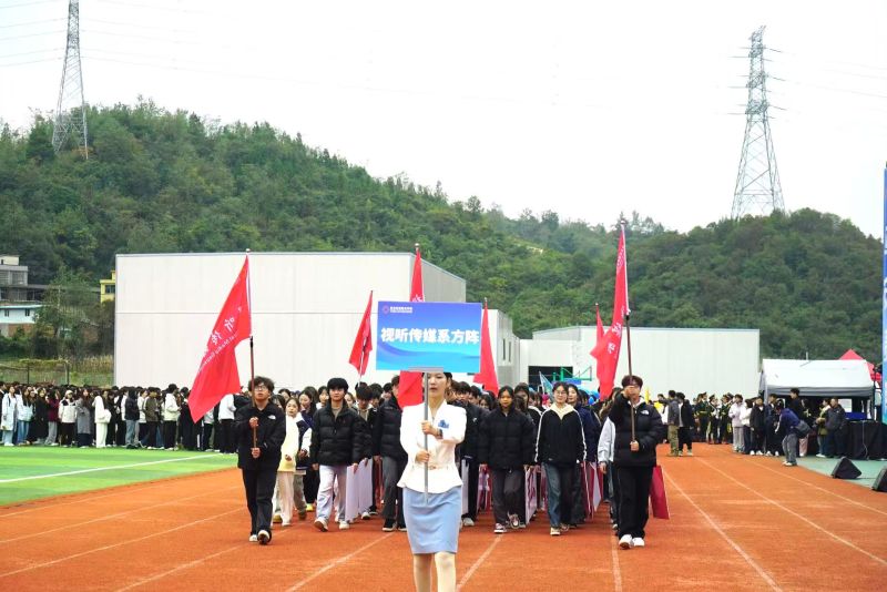 60人组成的彩旗队挥舞旗帜,如流动的色彩画卷,勾勒出“活力贵传”的青春轮廓。各方阵依次入场,系部方阵以专业特色为核心、创意展演为载体——新闻传播系演绎“声韵流芳”,用专业声音传递情感,彰显传媒人记录时代的纪实本色;视听传媒系呈现“光影匠心”,用镜头语言诠释理念,锤炼精益求精的职业功底;文化艺术系展现“文脉传承”,用艺术表达传递心意,尽显厚植底蕴的美学追求;经济管理系、信息工程系、公共基础部各展所长,共同勾勒出学院多元育人的生动图景。每支队伍3分钟的特色展示,将专业技能与体育激情紧密交织,运动场化作展现“团结、严谨、求实、创新”校风与“正己博学、厚生乐教”教风的“露天演播厅”,充分彰显传媒学子在智媒时代的青年担当。