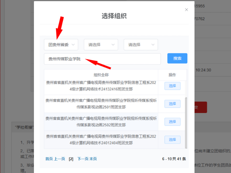 3、申请转入组织流程:根据下面图片搜索学院系部班级完成转接。