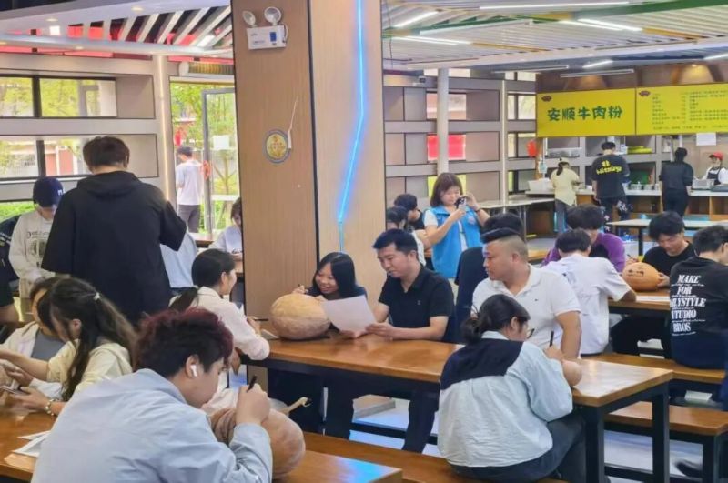 10月6日,“匠心传艺・瓜雕贺国庆”非遗体验活动在食堂一楼举行。学校提前协调场地、采购物资,邀请非遗瓜雕传承人黄师傅进校园。黄师傅先以讲座科普瓜雕历史与文化内涵,再现场演示雕刻技艺,几分钟便将普通南瓜雕琢成栩栩如生的荷花,引得同学们惊叹。实践环节中,党委委员、学工部部长陈亮来到现场,关心同学们的操作情况并鼓励大家大胆创新。青协志愿者全程协助,瓜雕师傅逐一指导,路过师生纷纷驻足点赞,师傅更是称赞同学们学得快、创意足。