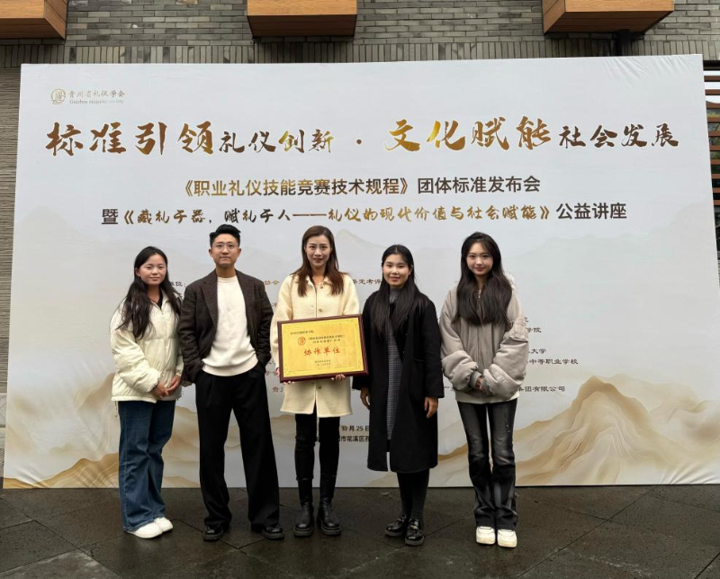 10月25日下午,《职业礼仪技能竞赛技术规程》团体标准发布会暨《藏礼于器,赋礼于人——礼仪的现代价值与社会赋能》公益讲座,在贵阳市花溪区孔学堂二期第一会议室顺利举行。贵州传媒职业学院作为《职业礼仪技能竞赛技术规程》团体标准的协作单位,当天组织师生参会,并在活动颁奖环节接受授牌。