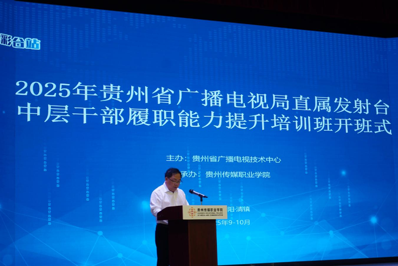 2025年9月22日上午08:50,由贵州省广播电视技术中心主办、贵州传媒职业学院承办的“2025年直属发射台中层干部履职能力提升培训班”开班仪式在学院播艺楼小剧场隆重举行。省广电局党组成员、副局长范华出席并作重要讲话,省广播电视技术中心主任陈卓提出培训纪律要求,学院党委副书记、院长李德建致欢迎辞。仪式由学院教师陈志强主持。
