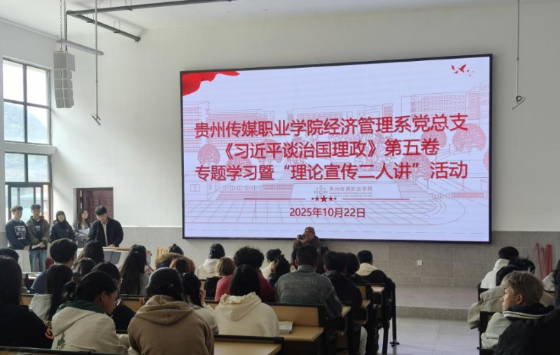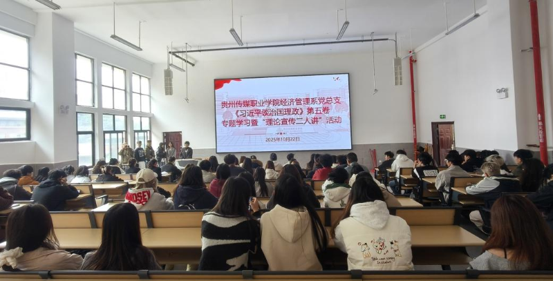 为深入学习贯彻习近平新时代中国特色社会主义思想,推动党的创新理论入脑入心、见行见效,2025年10月22日中午,贵州传媒职业学院经济管理系党总支在北1阶梯教室举办《习近平谈治国理政》第五卷专题学习暨“理论宣传二人讲”活动。经济管理系党总支副书记邓英主持活动,系部18名教师及93名学生代表共同参会。