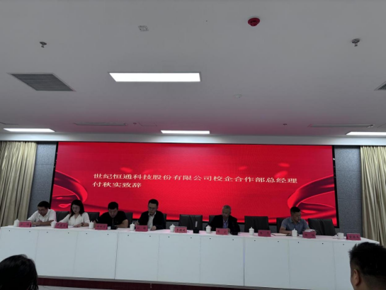仪式现场,学院副院长周宏与世纪恒通科技股份有限公司集团业务总监刘彬共同签署校企合作协议,明确双方在课程建设、师资共享、项目实践等方面的合作细则,为“人工智能现场工程师班”的人才培养奠定基础。