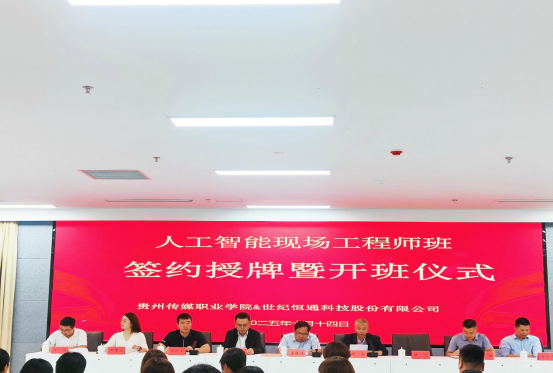 为响应教育部职业教育现场工程师专项培养计划,深化 “引企入教、产教融合”育人模式,10 月 14 日,贵州传媒职业学院与世纪恒通科技股份有限公司联合举办的“人工智能现场工程师班”签约授牌暨开班仪式圆满举行。双方将以此次合作为契机,共同培养懂技术、善实战、有德行的复合型人工智能应用人才,为传媒行业数字化转型注入新生力量。