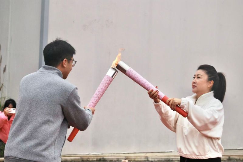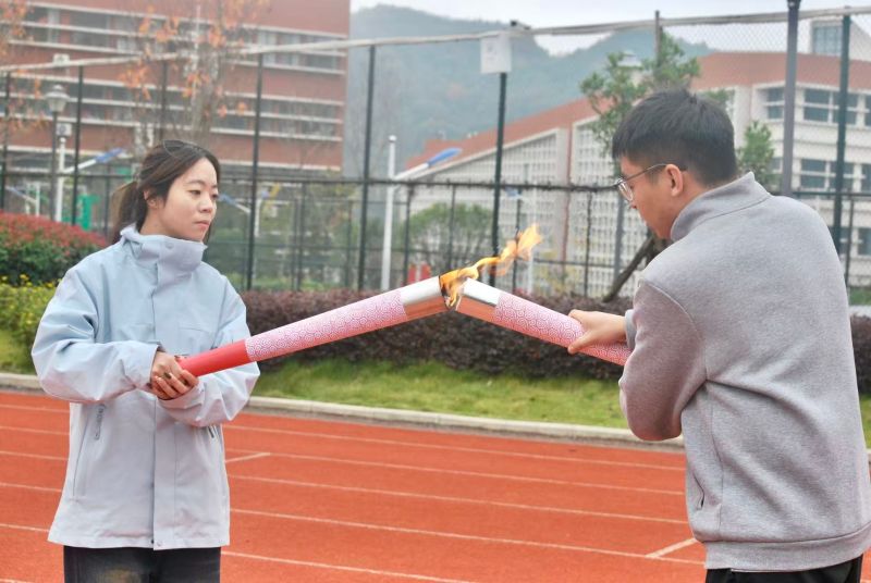 火炬传递仪式成为全场焦点。火炬从校门出发,途经授艺楼、图书馆、篮球场、全媒体综合中心等校园地标,由保卫、宿管、食堂工作人员代表,以及教师、辅导员、学生代表依次接力。传递过程中,接力间隙的自然问候、默契配合,文明素养内化于心、外化于行。这束火炬既串联起“平安贵传”的守护力量,更传承着体育精神中的团结与尊重,“弯腰精神”在薪火相传中更加深入人心,也让做“有礼貌、有素养”的时代青年要求在接力中悄然扎根。