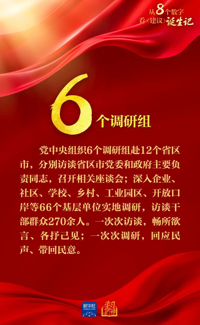 今天,新华社播发通讯《为基本实现社会主义现代化奠定更加坚实的基础——<中共中央关于制定国民经济和社会发展第十五个五年规划的建议>诞生记》。通过一组数字,一起来看这份纲领性文件是如何诞生的。