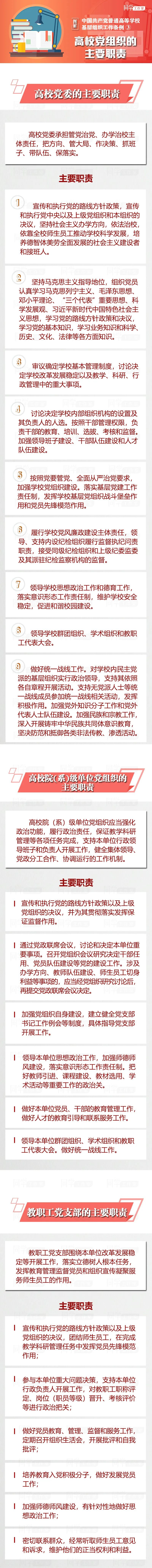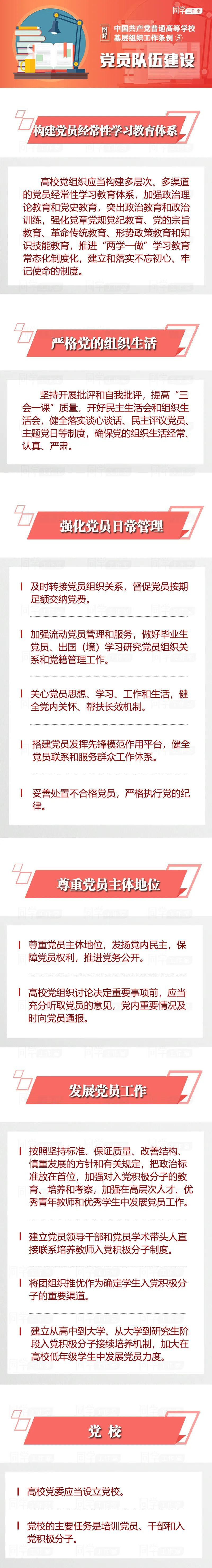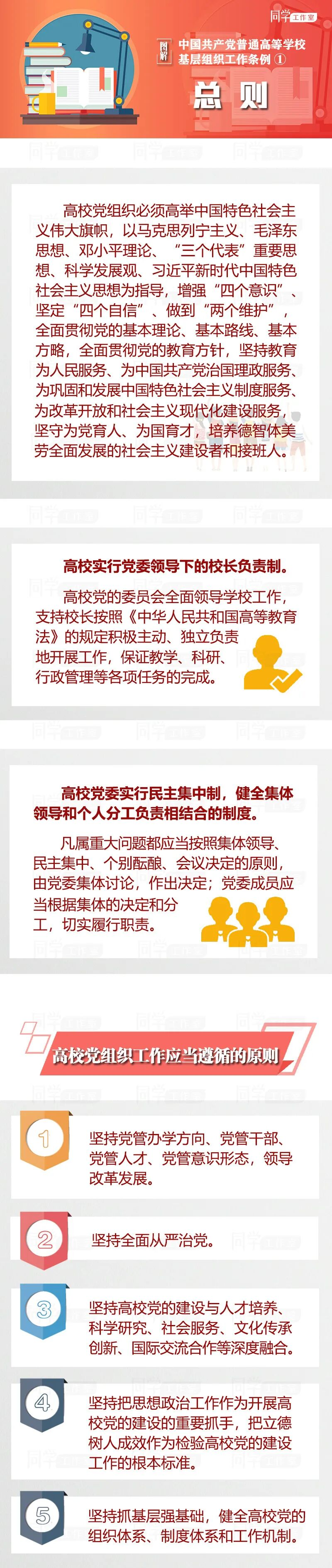 《中国共产党普通高等学校基层组织工作条例》以习近平新时代中国特色社会主义思想为指导,深入贯彻党的十九大和十九届二中、三中、四中、五中全会精神,以党章为根本依据,落实新时代党的建设总要求和新时代党的组织路线,对高校基层党组织工作作出全面规范,是新时代高校党的建设的基本遵循。《条例》的修订和实施,对于全面贯彻党的教育方针,落实立德树人根本任务,建设高质量教育体系、建设教育强国,具有重要意义。我们梳理了条例的相关内容,带领大家一起学习解读→