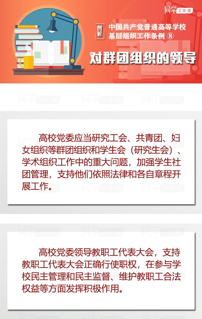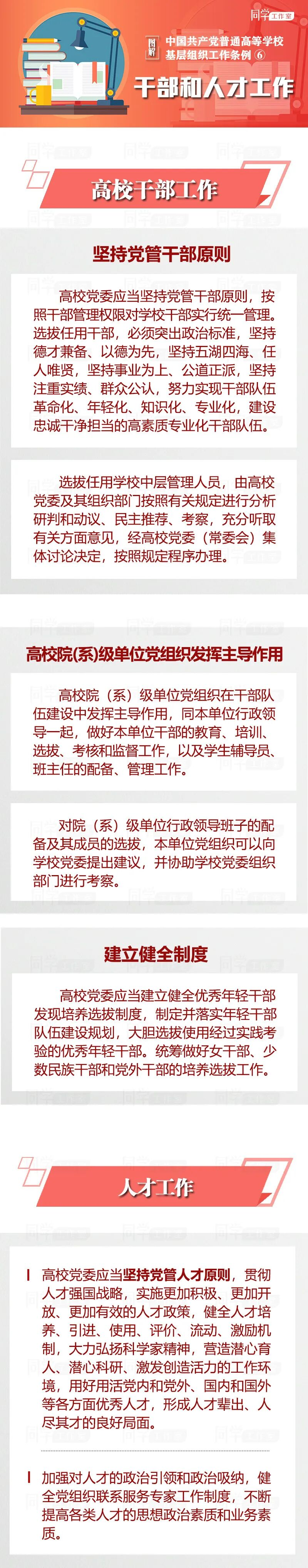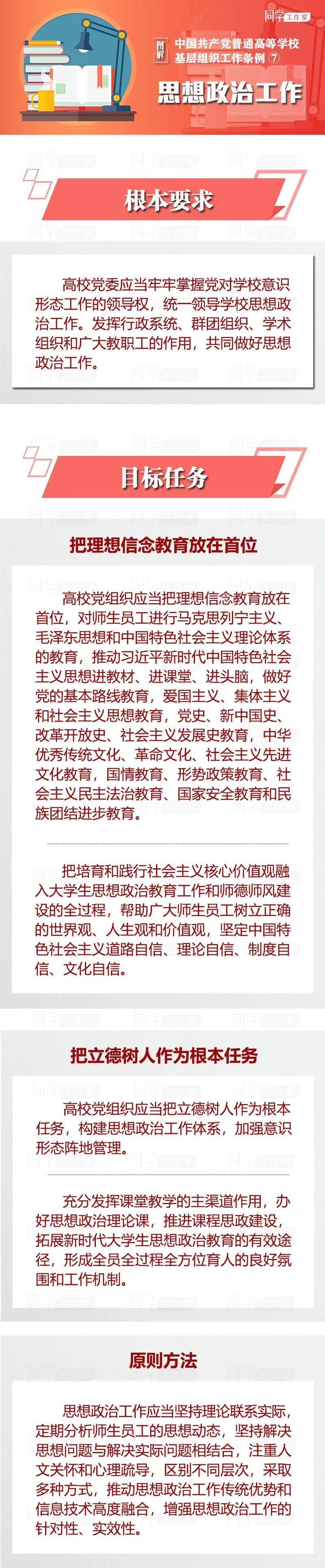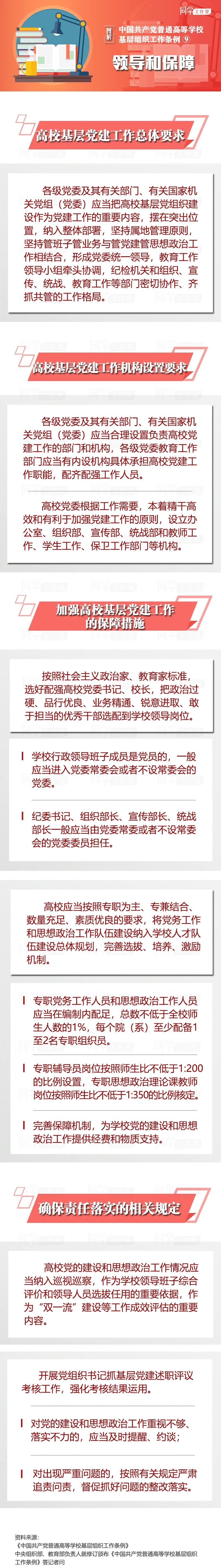 《中国共产党普通高等学校基层组织工作条例》以习近平新时代中国特色社会主义思想为指导,深入贯彻党的十九大和十九届二中、三中、四中、五中全会精神,以党章为根本依据,落实新时代党的建设总要求和新时代党的组织路线,对高校基层党组织工作作出全面规范,是新时代高校党的建设的基本遵循。《条例》的修订和实施,对于全面贯彻党的教育方针,落实立德树人根本任务,建设高质量教育体系、建设教育强国,具有重要意义。我们梳理了条例的相关内容,带领大家一起学习解读→